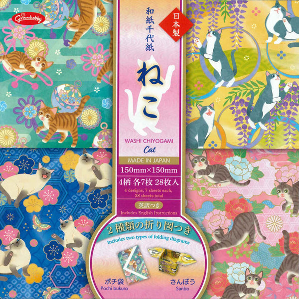 商品名:和紙千代紙 ねこ色:4柄・各7枚 (表紙の折った紙を除く)サイズ:15㎝×15㎝枚数:28枚メーカー:ショウワノート商品No:23-2087備考:「ポチ袋」「さんぼう」の折り図つき。(英訳付き)